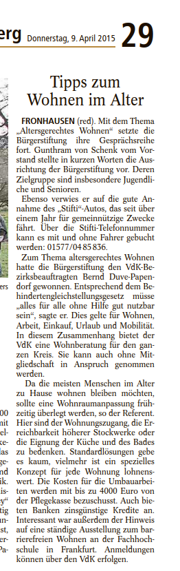 2015 Die Gesprächsreihe „Häusliche Pflege – Schaffe ich das alleine“ wurde mit der Veranstaltung im März 2015 beendet. Stimmbildungsseminar des Kirchenchores der ev. Kirchengemeinde Fronhausen, Neugestaltung des Außengeländes des Kindergartens Kinderland in Bellnhausen, Projekt Beachvolleyball.der SG Fronhausen